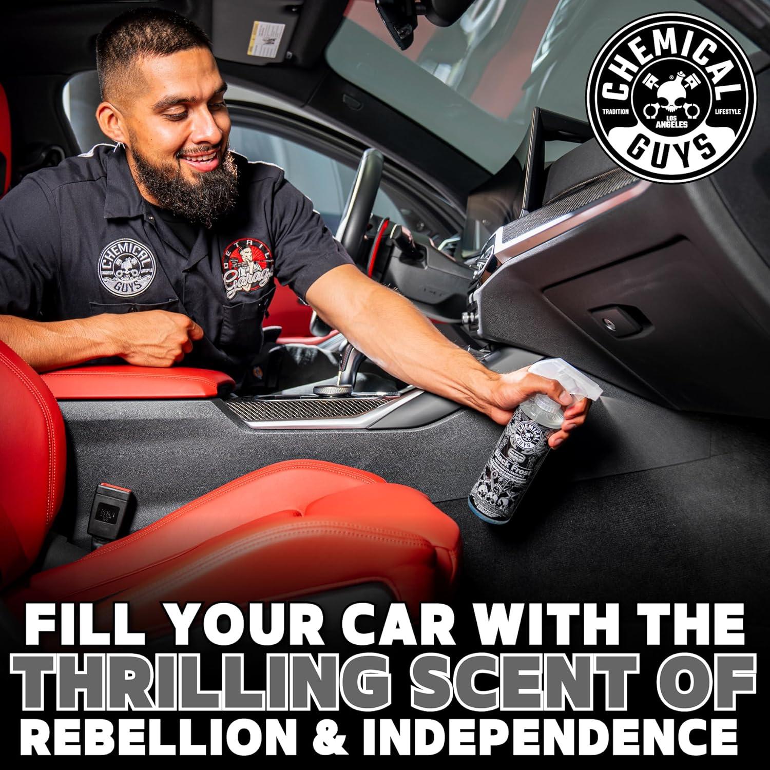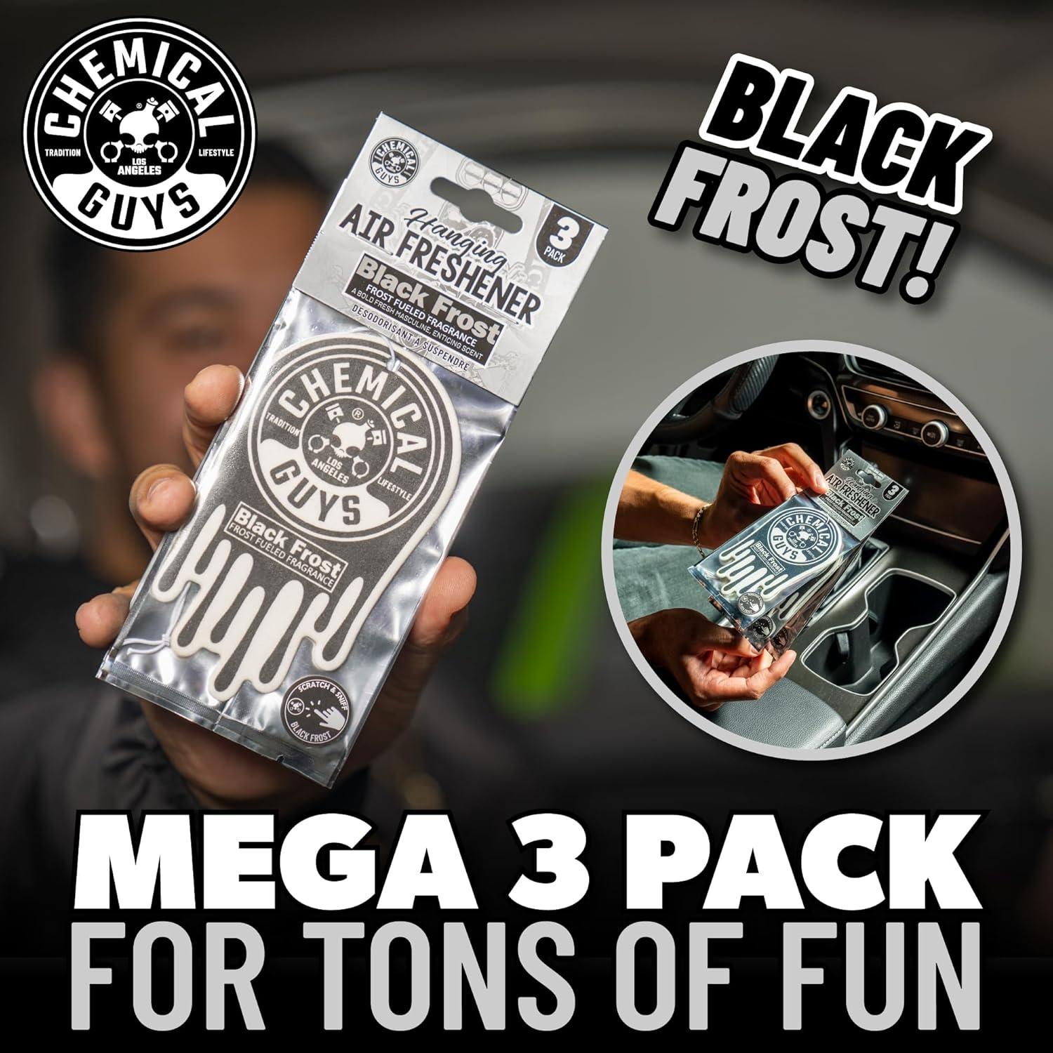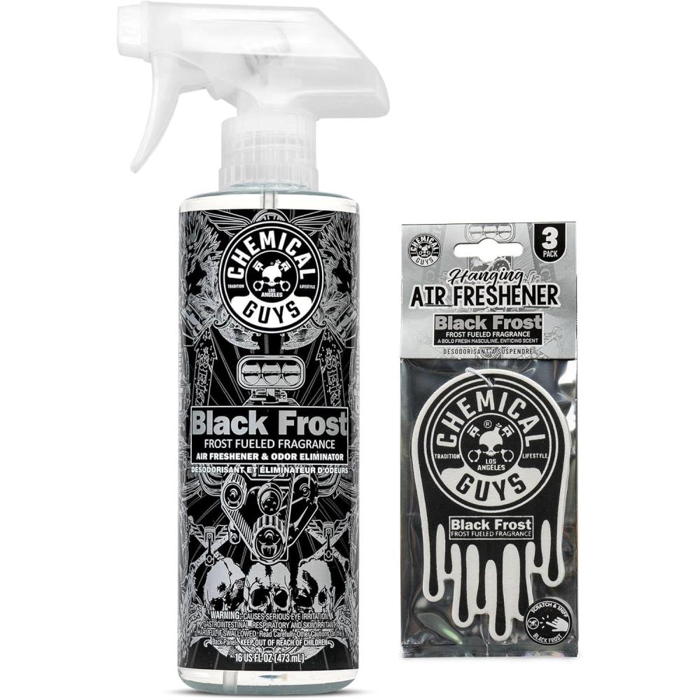 Chemical Guys Black Frost Air Freshener and Odor Eliminator, 16 fl oz Spray with 3 Pack of Hanging Air Fresheners (Great for Cars, Trucks, SUVs, RVs, Home, Office, Dorm Room & More) - HOL432(Frost)